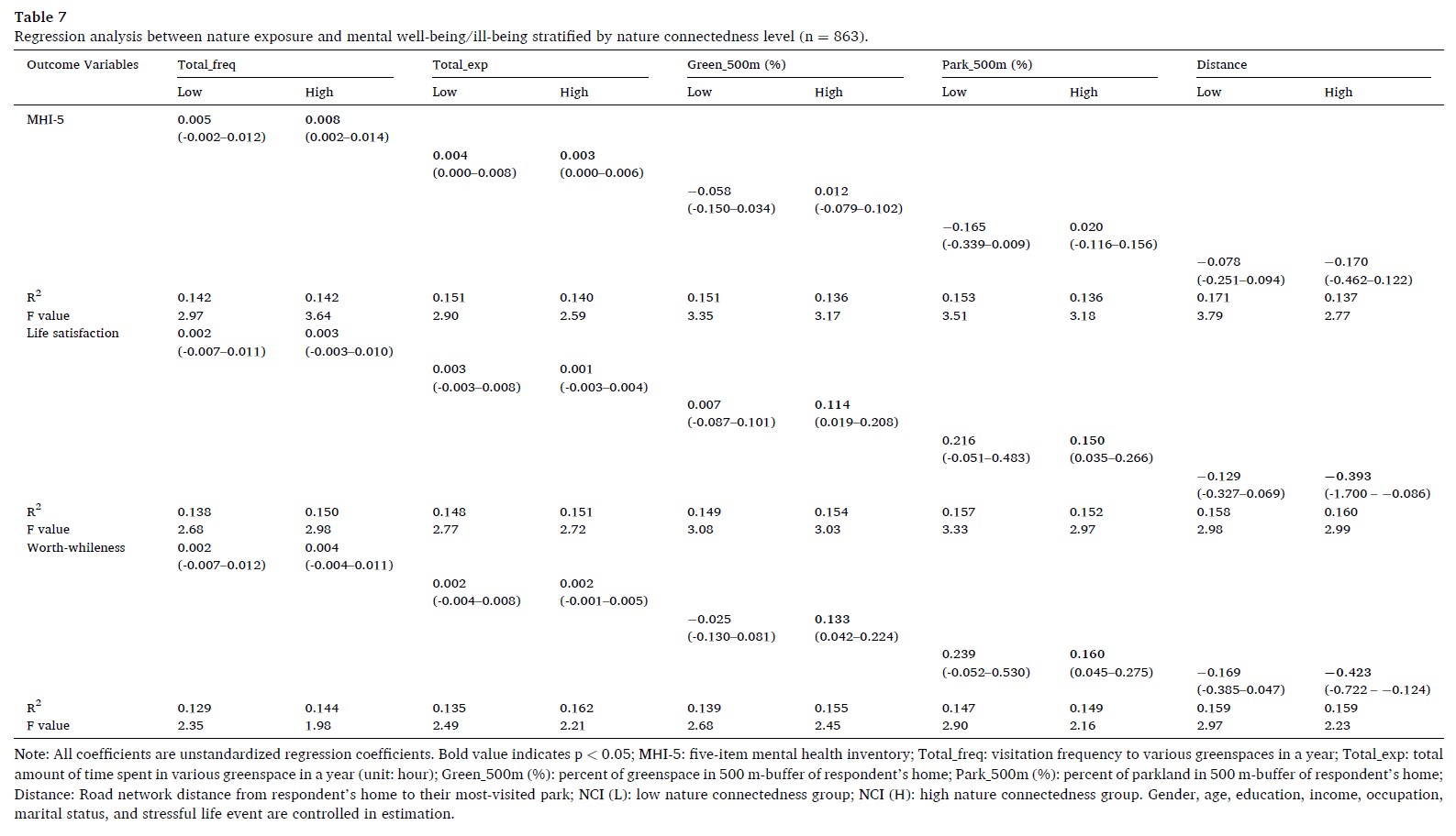 中科院华南植物园生态中心刘红晓博士在任海研究员指导下,于2020年在广州开展问卷调查,收集了居民绿地暴露指标(绿地访问频率、访问时长、小区500m范围公园面积以及最经常访问的公园距离)、自然联结度指标、心理健康指标(抑郁、生活满意度、生活价值感)。研究发现自然联结度在提高主观福祉方面的贡献超过了自然暴露,而自然暴露对缓解抑郁的贡献大于自然联结度。较高自然联结度的人群相比较低自然联结度的人群,生活价值感、幸福感分别提高了7%和6.4%,抑郁风险降低了2.5%。该研究发现绿地暴露的心理健康效应在自然联结度高的人群中更显著。研究表明,为了提高绿地暴露带来的心理健康益处,不仅要通过增加绿地或鼓励人们参加户外活动来提高绿地暴露,还需要提高人们的主观自然联结度。