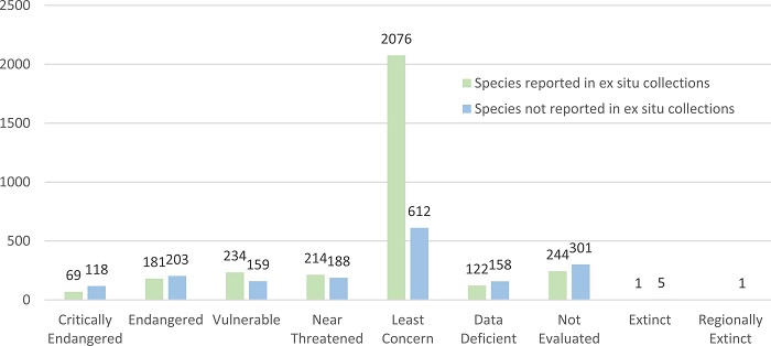 图4:中国树木各濒危等级在中国植物园迁地收集情况