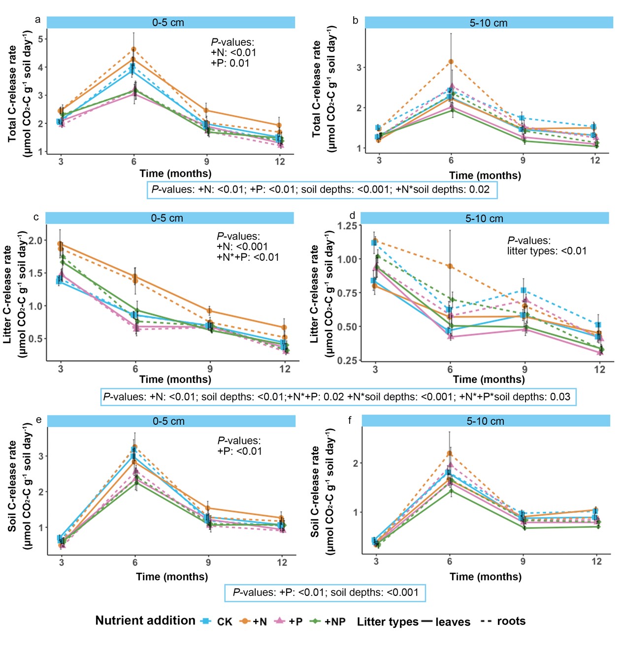 中科院华南植物园生态中心博士生张靖凡在王法明研究员的指导下,利用热带次生林氮磷添加的野外试验平台,进行为期两年的野外试验,在长期(11年)氮磷添加的土壤中,添加了两种不同的凋落物:玉米根或玉米叶。测量了土壤总碳矿化率(CO2通量)来表征总碳的矿化,使用13C同位素示踪来确定碳的来源(土壤碳或凋落物碳)。通过测定与碳矿化相关的胞外酶(β-1,4-葡萄糖苷酶(BG)、酚氧化酶(PHO)和过氧化物酶(PER))以及磷脂脂肪酸(PLFA)表征的土壤微生物群落结构,通过机构方程模型来解释土壤碳释放速率对不同施肥处理的响应。