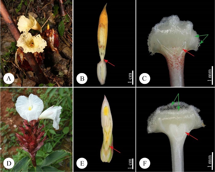 图1. 地莴笋花属的光叶地莴笋花(A?C)和莴笋花属的闭鞘姜(D?F)花序及花形态对比。A. 基生花序;B. 花蕾纵切,红色箭头示花冠管基部与花柱合生;C. 柱头,绿色箭头示2裂片等大,红色箭头示附属物2裂,裂片角状;D. 顶生花序;E. 花蕾纵切,红色箭头示花冠管基部与花柱离生;F. 柱头,绿色箭头示2裂片一大一小,红色箭头示附属物2裂,裂片半圆形。