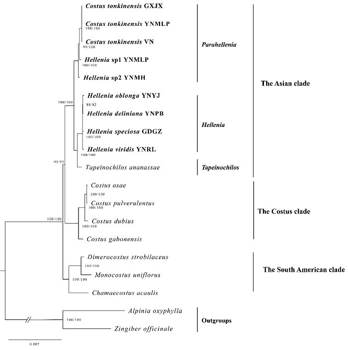 闭鞘姜科Costaceae全世界有7属120余种,主要分布于泛热带地区。广义闭鞘姜属Costus L.是闭鞘姜科最大的属。先前基于叶绿体trnL-F、trnK基因片段和核基因ITS的分子系统发育研究结果将闭鞘姜科分为三个主要分支,即南美洲分支、亚洲分支和非洲-新热带分支;同时将广义闭鞘姜属拆分成狭义闭鞘姜属Costus、喇叭姜属Chamaecostus C.D. Specht & D.W. Stev.、独叶姜属Paracostus C.D. Specht和莴笋花属Hellenia Retz.。其中,莴笋花属约10种,主要特征为茎具分枝,苞片木质化,唇瓣大而明显,柱头2片状且具2裂的附属物。由于形态性状研究不足,该属存在种间界限不清、物种鉴定困难等诸多分类学问题。先前的分子系统发育研究还表明莴笋花属并非单系类群,由于取样仅涉及3种莴笋花属植物,莴笋花属的系统发育关系仍然需要进一步研究。