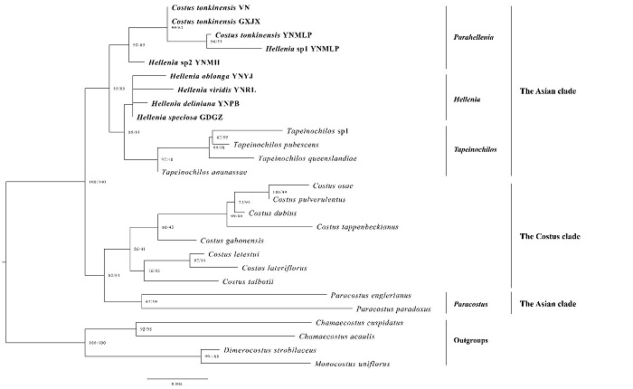 图3. 基于叶绿体组编码基因构建的闭鞘姜科系统发育树。