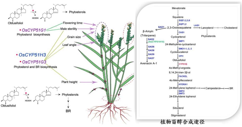 图:水稻CYP51家族成员(OsCYP51G1/G3/H3)参与的植物甾醇及植物激素油菜素甾醇合成与功能示意图