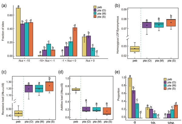 图2. 报春苣苔和牛耳朵纯化选择作用强度、遗传负荷以及适应性进化速率比较