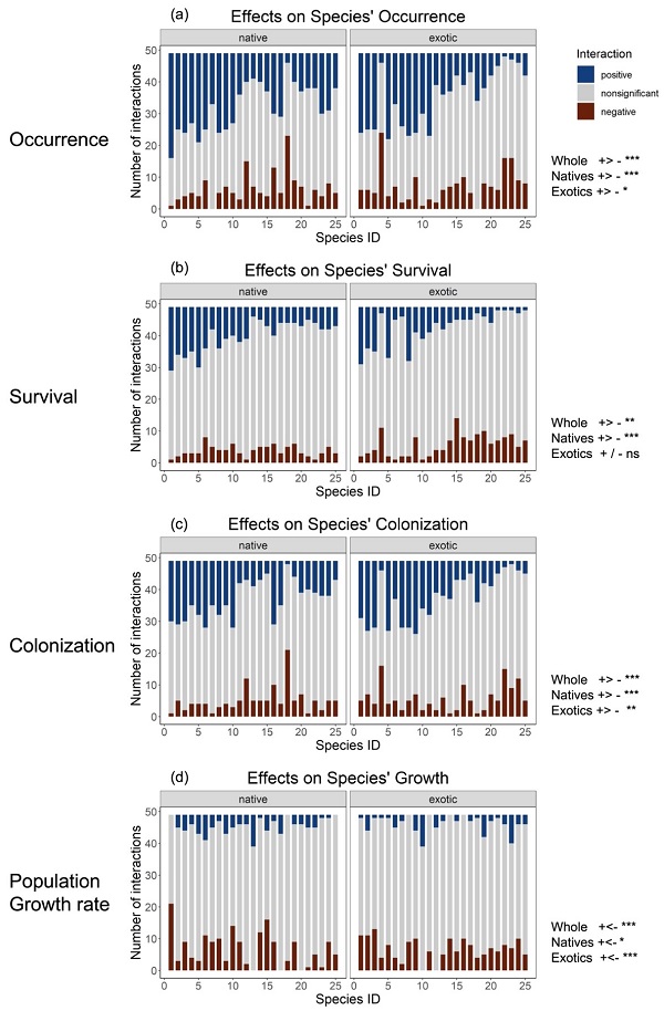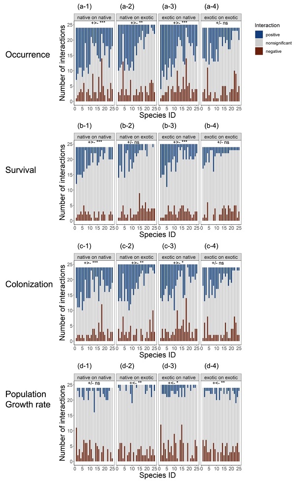 中科院华南植物园生态研究中心助理研究员殷德意,以480个长期连续观测的植物演替群落样地为研究对象,通过分析样地近60年演替进程中,本地植物和外来植物间的相互作用的方向与强度,发现植物间正相互作用在自然群落中具有与植物间负相互作用相似甚至更高的普遍性。同时,正、负相互作用的相对频率随建群阶段以及本地种和外来种之间的变化而变化。具体而言,正相互作用在建群早期阶段(出现、存活、定殖)更普遍,而在后期阶段(种群增长)则是负相互作用更为普遍(图1)。本地植物的正相互作用的频度和强度均高于外来物种(图2),进而抑制群落中已有外来种对其它外来种的促进作用。即本地植物相较外来植物在植物间正相互作用中获益更多,降低了群落的可入侵性。