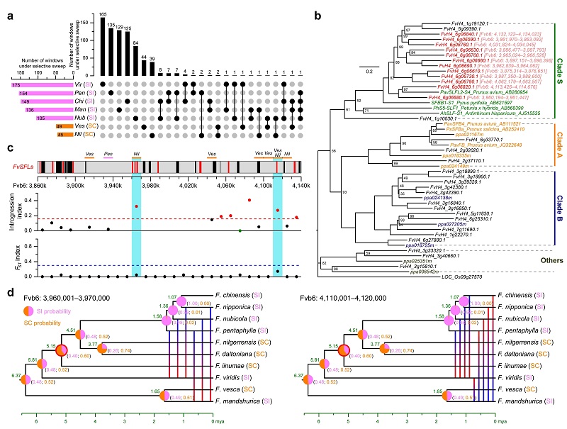 华南植物园康明研究团队利用全基因组重测序数据重建了10个野生二倍体草莓(占所有野生二倍体草莓的83%)的系统发育关系,探讨了重组率变化对系统发育关系和基因组渐渗的影响,发现低重组率的基因组区域具有更低的杂交渐渗与不完全谱系分选,以及更一致的系统发育信号,可以反映更真实的系统发育关系(图1,图2)。野生二倍体草莓存在复杂且广泛的杂交渐渗,物种间平均渐渗率约占整个基因组的4.1%。渐渗更倾向于保留在高重组、低基因密度的基因组区域(图2)。祖先态模拟揭示了自交不亲和性状丢失后而重新获得。同时发现自交不亲和性状的重新获得可能与受到正选择的控制花粉识别的SLF基因的历史渐渗有关(图3)。该研究为野生二倍体草莓的进化历史和杂交渐渗的基因组特征提供了新视角,为杂交渐渗在植物交配系统转变中的作用提供了新证据。