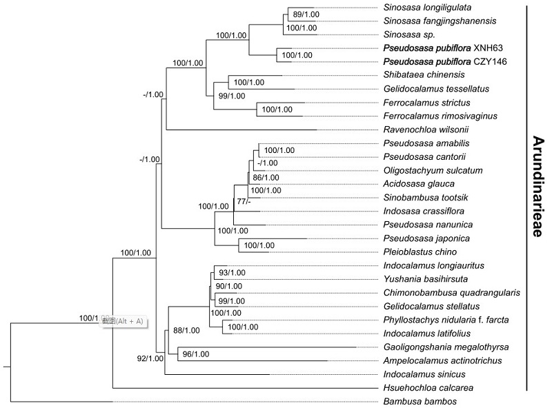 图2. 基于叶绿体基因组数据构建的青篱竹族系统发育树,示以礼竹(毛花茶秆竹)的系统位置