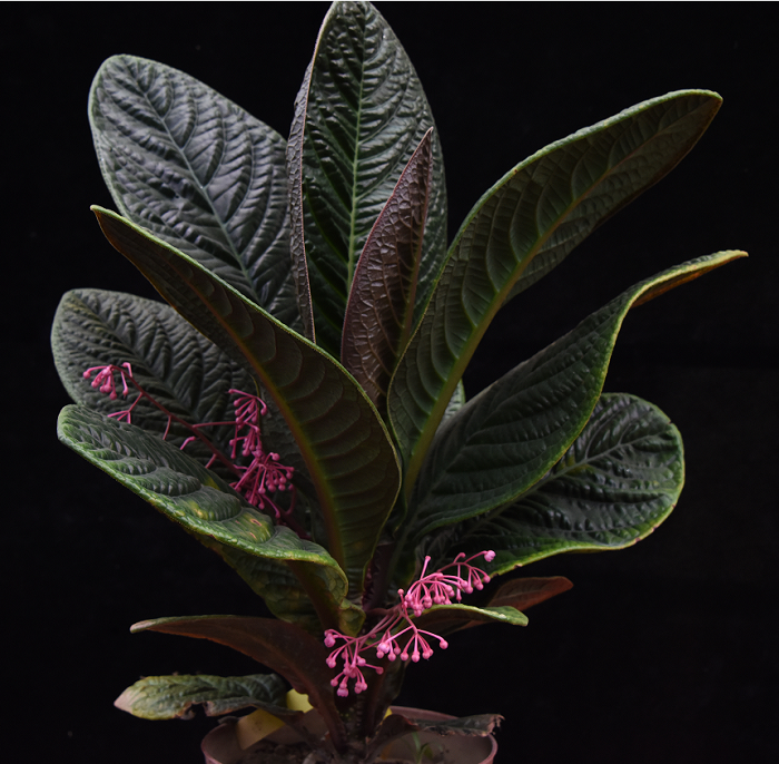 紫金牛属新品种‘紫红荷1号’和‘紫红荷2号’是从粗茎紫金牛(Ardisia gigantifolia Stapf)引种栽培群体中选育而来。‘紫红荷1号’和‘紫红荷2号’均为常绿灌木,茎直立不分枝,株高30-50cm,叶片表面深绿色,背面紫红色,革质,两个品种在花序轴、花萼、花瓣和果实等的颜色上存在明显的差异。这2个新品种为优良的观叶、观花、观果灌木,具有很强的耐阴性,可用于林下种植和室内盆栽观赏,具有较好的开发利用潜力。