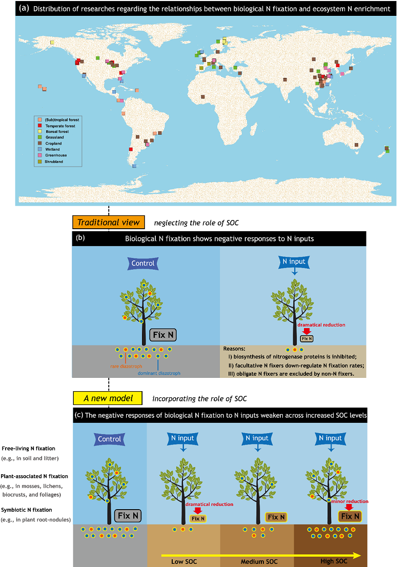 中国科学院华南植物园郑棉海研究团队从生物固氮“耗能”的角度出发,探索碳与生物固氮的关系。基于陆地生态系统672项相关研究进行整合分析,发现虽然氮添加抑制陆地生物固氮速率,但该抑制效应随着土壤有机碳的增加而减弱。在中、高碳土壤中(10-20、>20 mg/g SOC),氮添加处理对多种固氮策略(自生、共生固氮等)的负作用弱于在低碳土壤中(<10 mg/g SOC)的负作用。氮添加对固氮微生物丰度和多样性的负效应也随土壤有机碳浓度的增加而减弱。导致上述现象的可能原因是高浓度有机碳潜在提供更多“碳能”驱动生物固氮,以及固氮微生物需要维持自身碳氮化学计量比平衡。