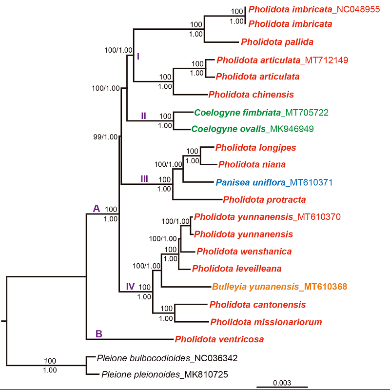 在综述之前工作的基础上,该研究基于叶绿体全基因组序列进一步探讨了石仙桃属及其近缘属之间的系统发育关系,结果表明,传统意义上依据唇基囊状界定的石仙桃属为多系,分为四个主要分支(图1):狭义石仙桃属(Pholidota s.s)与包含贝母兰属(Coelogyne Lindl.)部分代表物种的一个分支构成姊妹群;另外两个分支分别与蜂腰兰属(Bulleyia Schltr.)和曲唇兰属[Panisea (Lindl.) Lindl.])的代表物种聚在一起; P. ventricosa偏离该属所有其他物种,稳定处于系统发育树的基部。尽管唇基凹陷的性状在石仙桃属物种间表现出相似性,但经历了多次独立进化而产生,为非同源性状,而石仙桃属多数分支得到子房是否被毛、花苞片形态等形态共衍征的支持。