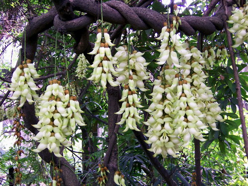 禾雀花(Mucuna birdwoodiana Tutcher),蝶形花科黎豆属,又名白花油麻藤、雀儿花,常绿木质大型藤本。分布于广东广西,喜温暖湿润气候,耐荫耐旱,畏严寒。该种生长迅速,蔓茎粗壮,叶繁荫浓,茎长可达30米以上,其生命力顽强,能盘树缠绕,越冠飞枝,攀石穿缝。其花序悬挂于悠长盘曲的老茎上,吊挂成串,每串二、三十朵,串串下垂。酷似无数白中带翠,如玉温润的小鸟栖息在枝头。