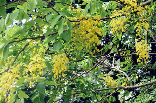 腊肠树(Cassia fistula L.),又叫阿勃勒、牛角树、波斯皂荚、金急雨。豆科(Leguminosae)乔木。叶为偶数羽状复叶。花黄色。荚果圆柱形,长30~60cm,成熟时黑褐色,好似一根根挂在树枝上的腊肠,内有种子近100粒。腊肠树分布在印度、缅甸和斯里兰卡。我国南部和西南部各省区有栽培。花期6~7月,果期9~10月。