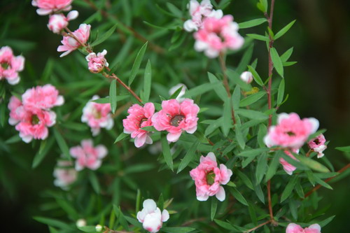 松红梅(Leptospermum scoparium)为桃金娘科(Myrtaceae)常绿小灌木。株高约2米,分枝繁茂,枝条红褐色,较为纤细。叶互生,叶片线状或线状披针形。花有单瓣、重瓣之分。花色有红,粉红,桃红,白等多种颜色。在适宜环境下,花期可长达300天之久,堪称“花界劳模”。