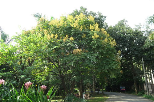 国庆节期间,华南植物园木本花卉区有一种植物也感知到节日的到来,树上“张灯结彩”,欢天喜地,一派节日气氛,别提有多应景!它就是复羽叶栾树,因在国庆期间盛开,故又叫国庆花。花开时节,花果同挂枝头,满树金黄色小花,鲜红色膜质果皮膨大如小灯笼,成串挂在枝顶,因此复羽叶栾树又有“灯笼树”、“摇钱树”的形象别称。