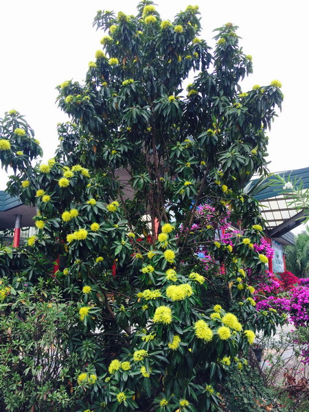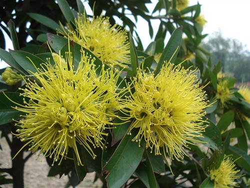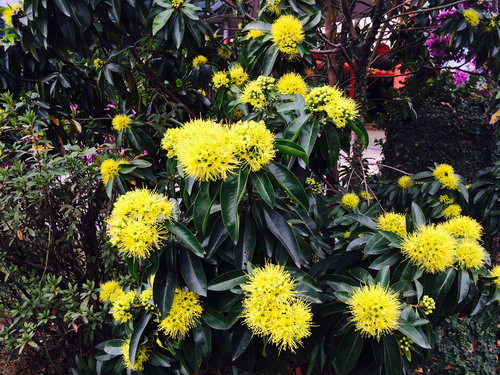 金蒲桃(Xanthostemon chrysanthus (F. Muell.) Benth.),别名黄金熊猫、黄金蒲桃,澳大利亚特有植物。桃金娘科(Myrtaceae)常绿小乔木,叶对生、互生或丛生枝顶,披针形,全缘,革质,叶表光滑,搓揉后有番石榴气味,新叶带有红色。花序呈球状,初开时黄绿色,随后转为黄色,近凋谢时为金黄色。虽说是花,其实其花瓣已退化,只有明显的圆形萼片和花蕊,雌雄蕊长3~5cm,丝丝放射,格外别致。全年有花,盛花期为11月到次年2月,果为蒴果。
