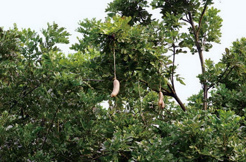 吊瓜树(Kigelia africana (Lam.) Benth.),又名吊灯树、羽叶垂花树。紫葳科乔木。树高可达20米以上。主干粗壮,树冠广圆形。每年春末夏初开花,花桔黄色或褐红色,花大艳丽,成串下垂,宛如一串串风铃在风中摇曳,十分迷人。最让人称奇的是它圆柱状的浆果在秋季成熟,长30-40厘米,粗如碗口,硕大的果实形状各异,一个个形状似大香肠的果实拖着长长的尾巴倒挂枝头,颇为壮观。一株丰产吊瓜树的大树,年产鲜果80-150个,果形硕大,果期长达半年,吊挂枝头,久久不落,立于树下,令人顿有“瓜果满栅迎亲人”之遐想。但令人遗憾的是,吊瓜树的“瓜”不能吃,因其果实木质纤维极多。 现在可以在华南植物园观赏到吊瓜树的果实。