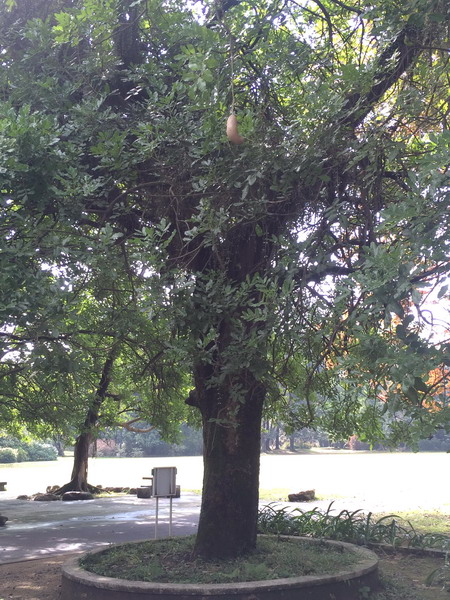 华南植物园上世纪60年代从西非引入的吊瓜树,经历了50年的风风雨雨,当年的小吊瓜树如今长得高大茁壮,枝繁叶茂,年年开花结果,“子孙满堂”。