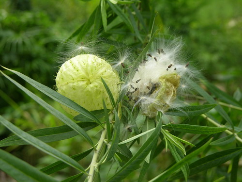 气球果(Gomphocarpus fruticosus (L.) W. T. Aiton),又名河豚果、钉头果、风船唐棉。萝藦科(Asclepiadaceae)亚灌木,高达1.8米。叶片线形,较尖,形似柳叶,表面光滑,叶色浓绿,背面稍淡。花白色至淡黄色。花期极长,每年从秋开到初春。果实黄绿色,卵圆形、圆鼓鼓的,既像是充足了气的气球,又像是正在生气的河豚,所以就有了气球果和河豚果的美称,非常奇特。果内除种子外,中空无果肉,用手轻轻一捏即扁,稍后又复原,很像气球。气球表面有粗毛,似用钉子锤入,所以也叫“钉头果”。果实成熟后能自行爆裂,种子上部附生银白色绒毛,形似降落伞,随风飘到各处播种,故又名“风船唐棉”。