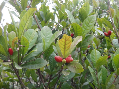 神秘果(Synsepalum dulcificum Daniell),别名:变味果,属山榄科(Sapotaceae )。它是典型热带常绿灌木,鲜少落叶,树高2~4米,生长缓慢,树形略呈尖塔型。初叶为浅绿色,老叶呈深绿或墨绿色,叶革质,呈倒披针形或倒卵形。每年4到10月份开白色小花,花开叶腋,花有淡淡香味,花期4~6周,花后开始结果,果实为绿色椭圆体浆果,成熟后呈橙红色,果实具宿存花柱,内有一粒种子和少量白色甜味的果肉,汁少。