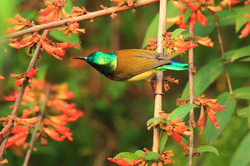 植物世界无奇不有,华南植物园里花型像小鸟一样逼真的禾雀花(蝶形花科油麻藤属)刚落下帷幕。苏铁园里,像极了小虾的虾子花又开得正灿烂。满树活蹦乱跳的“小虾”,不仅吸引了游客驻足观赏,更吸引了众多鸟儿前来觅食,莫非鸟儿们也喜欢这南方的“海鲜”口味?今天就让我们和鸟儿们一起来分享这海鲜大餐吧。
