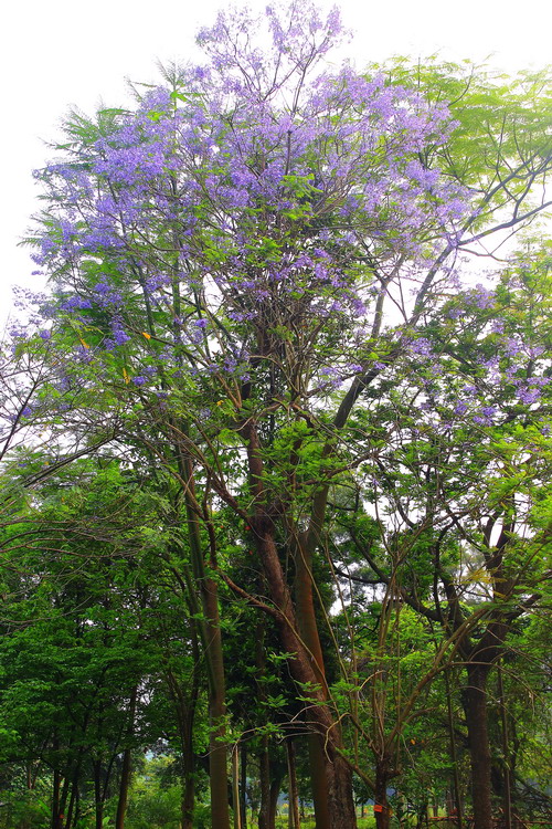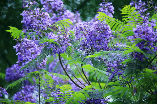 蓝紫色朵朵小花簇傲立枝头,羽状叶片轻盈摇曳。此情此景颇有几分‘紫玉’妆成一树高、万尾羽毛轻飘飘之意境。木本植物中很少开蓝花,高大乔木中开蓝花的就更少,因此蓝花楹更显珍贵。蓝花楹在世界各地广受欢迎,澳大利亚街道两旁种植许多蓝花楹;南非行政首都比勒陀利亚有“蓝花楹之城”的美誉。
