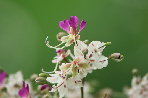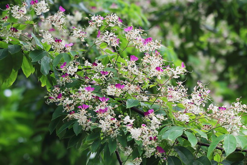 短萼仪花是优美的乡土园林景观树种,具典型的“变色花”特性,花未开时,花托呈嫩绿色,初开时花瓣为白色,盛开时变成紫色,可谓花色多变。花开时节,整个树冠绿色、白色、紫色共存,繁花朵朵,非常美丽。花期4-5月;果期8-9月。