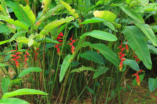 炎炎夏日,正是姜园最精彩的时节,各种姜目植物纷纷盛放。远远望去,绿树丛中不知是谁挂上了一串串红色的鞭炮,特别引人注目。再定睛注目,才发现是一串串花色艳丽造型奇特的“小鸟”,它就是我们今天要介绍的主角——金嘴蝎尾蕉。