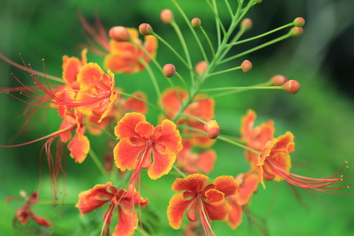 炎炎夏日,艳阳高照,路上行人都把自己武装得严严实实,或打遮阳伞或带遮阳帽。在华南植物园里,绿树成荫,游人三五成群,或亲朋或好友相约在一起,享受这大自然赐予的清凉。在华南植物园的生物园里,洋金凤不惧酷暑花开得正艳,树形轻盈婀娜,优美动人。在阳光的照射下,鲜红色或橙黄色的花儿交相辉映,像传说中的火凤凰在林间飞舞,尽情绽放自己。