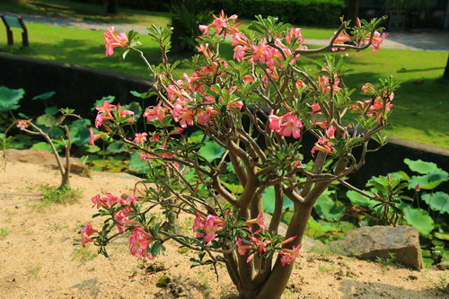 沙漠玫瑰因茎干肉质、富含浆汁,且形状奇特、花大色艳而成为著名的多浆植物之一。树形古朴苍劲,优雅飘逸,叶色翠绿,花朵艳丽,是室内盆栽观赏之佳品。