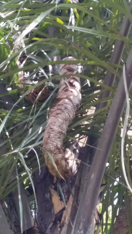 酒椰怕冷,原产赤道非洲几内亚湾沿岸,适宜在在高温、高湿、温差小的环境下生长。这几株是1983年从西双版纳植物园引种的。根据33年来的栽培观察,在广州露地栽培经常有冻害,每年冬季都要用塑料薄膜给植物搭建一个小温室,让其安全过冬,植株长大后,抗寒力稍强。这几株象鼻棕能度过33年来的多次寒潮,直至开花结果,实属不易,是棕榈园几代人33年来精心呵护的结果。