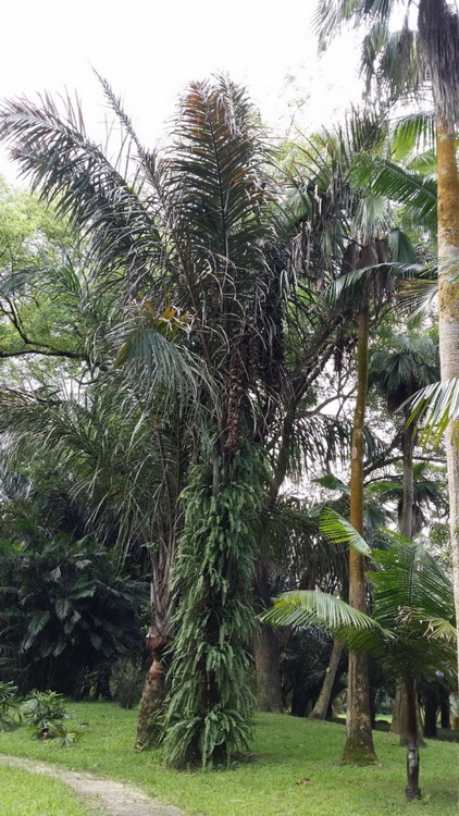 在这个大千世界里,由于遗传多样性、物种多样性、生境多样性的原因,植物在大小、形态、结构、色彩、成分及气味等方面千差万别,华南植物园里的花草树木多姿多彩,有的像小鸟,有的酷似小虾,颜色有红、黄、蓝、紫、白等等,可谓千姿百态,五彩缤纷。在这里,给大家介绍一种奇特的棕榈科植物,它的花序长长的,从树叶中伸出、下垂,末端向内微弯,花序上的苞片灰褐色,从树下望去,很像大象的鼻子。这种植物叫酒椰(Raphia vinifera P. Beauv.),也常常被形象地称为象鼻棕。