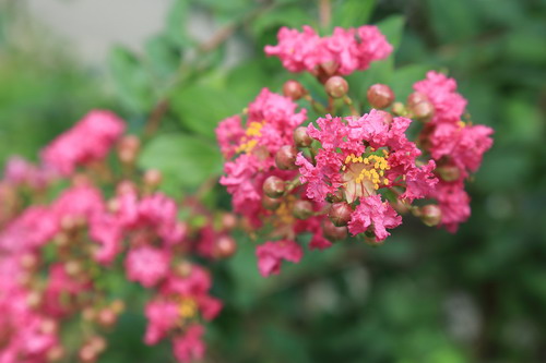 紫薇(Lagerstroemia indica L.),又叫痒痒树、百日红、满堂红。千屈菜科(Lythraceae)落叶灌木或小乔木。圆锥花序着生于当年生枝端,花白、堇、红、紫等色;花瓣6、近圆形,边缘皱缩状,基部具长爪。雄蕊多数,生于萼筒基部。蒴果近球形,基部具宿存花萼,幼时绿色至黄色,成熟时或干燥时呈紫黑色,室背开裂;种子有翅。分布于华东、华中、华南及西南诸省。原产亚洲,广泛栽培于热带、亚热带地区。花期6-9月,果期9-12月。