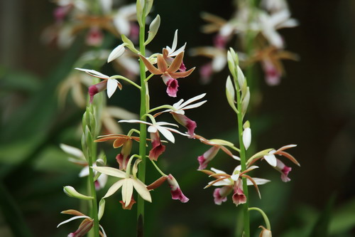 鹤顶兰(Phaius tancarvilleae (L’Hér.) Bl.)为兰科多年生常绿地生草本。植株大型,高70~80cm;假鳞茎圆锥状,粗短肥厚、肉质,被鞘;叶2~6枚,互生,阔长圆状披针形,长30~80厘米,宽6~12厘米,纸质,具纵向折扇状脉。总状花序由假鳞茎基部或叶腋抽出,粗壮直立,高达60~110 cm,着花10朵~30余朵,花大,美丽,直径7~10cm,背面白色,内面暗赭色或棕红色;唇瓣管状,与另外5个花被片巧妙组合,宛如仙鹤展翅飞翔。花被片的背面为白色,唇瓣为红色,因此又被称为“花白心红”,极富特色。花期春末夏初。