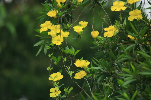 猫爪藤(Macfadyena unguis-cati)属紫葳科多年生木质攀缘藤本植物,因其叶子顶端长有吸附能力很强、酷似猫爪的三枚小钩状卷须而得名。枝叶纤细,具三叉卷须。叶对生,二出复叶,阔披针形或长卵形,先端尖,全缘或波状缘。春末至夏季开花,花冠长筒铃形,先端五裂。黄色,明艳醒目。原产热带美洲的危地马拉、阿根廷等地。喜砂质壤土,阳性。