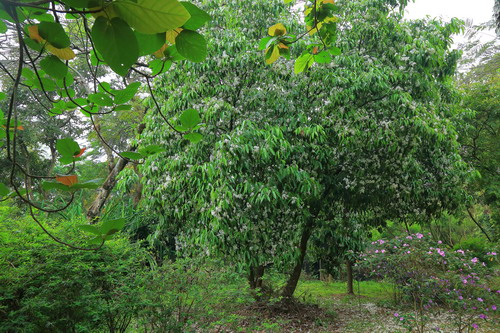 花开时灿烂,繁花满树,万千白蝶舞枝头;花落时凄美,边开边落,洋洋洒洒铺满地。捡起地上的落花仔细端详,洁白的花瓣中间一点红色,令人顿生怜惜之情,这就是蕊木开花时节的情景,边开边落,充满诗意。