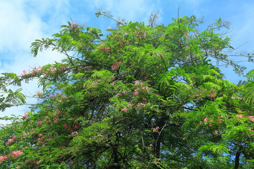 爪洼决明(Cassia javanica subsp. nodosa (Roxb.) K. Larsen & S. S. Larsen),豆科腊肠树属半落叶乔木。树冠开展。树皮灰黄褐色,粗糙。羽状复叶有小叶6—13对。花粉红色,开花时花叶相映,翩翩起舞,极为壮观。原产印度尼西亚、马来西亚、泰国。华南有栽培。花期5-6月。