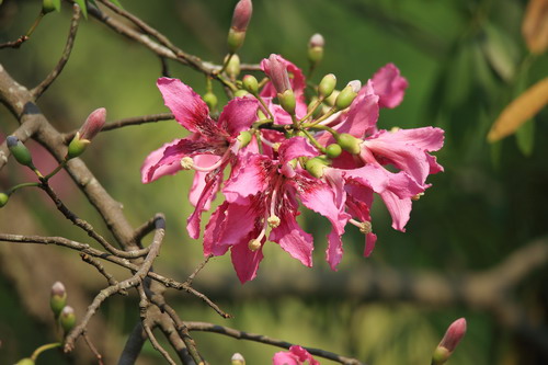 美丽异木棉(Ceiba speciosa (A.St.–Hil.) Ravenna),木棉科落叶大乔木。树干下部膨大,密生圆锥状皮刺。掌状复叶有小叶5—9片。花冠淡紫红色,中心白色;花瓣5枚,卵形,略反卷;花丝合生成雄蕊管。花期8—10月。美丽异木棉花谢后结果,果实有的大的像柚子,一个个如炮弹般倒挂在光秃秃的枝杈上,甚为壮观。果实成熟后,厚厚的外皮自然脱落,一团白色的絮状物脱颖而出,洁白炫目,悬挂在枝头,状如成熟开裂的棉花团,这些絮状物柔软性、保暖性还胜过真正的棉花,用它还可以填充枕头。美丽异木棉原产南美洲,华南植物园于1976年从美国洛杉矶引种并扩大繁殖。目前广植于广东、云南、海南、广西、福建等省区。