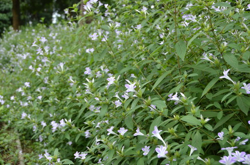 您仔细地观察,每一朵花的花瓣上都有紫色、白色相间的条纹,较平日里所见的蓝紫花的假杜鹃和白花假杜鹃多了几分色彩和变化。一朵朵花儿簇拥枝头,紫色、白色的花瓣在空中舒展着,宛如一只只伸长了脖子的鹤儿曼舞岁末,又如一个个小喇叭高歌寒冬,这正是: