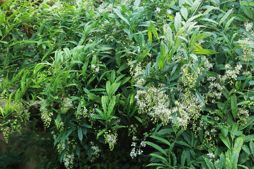 垂茉莉(Clerodendrum wallichii Merr.),又名垂枝茉莉、黑叶龙吐珠,马鞭草科(Verbenaceae)常绿灌木,高可达1-2米,小枝四棱形或呈翅状。叶对生,披针形。聚伞花序排列成圆锥状,下垂。花冠白色,花瓣5枚,雄蕊及花柱伸出花冠,花丝在花后旋卷,花朵形似白蝴蝶。枝条纤细,花姿飘逸,盛开时花香扑鼻,故名垂(枝)茉莉。花期为秋天10月至第二年春天4月,果期为春夏之际。果成熟时,花蕚增大增厚,由鲜红色转为紫红色,衬托着小巧玲珑果实。球形核果,初时黄绿色,成熟后光亮紫黑色,倒挂,故有“黑叶龙吐珠”之称。