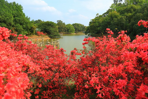 而在华南植物园杜鹃园及中心大草坪,粉的似霞、白的似雪、红的似火的150多个杜鹃花品种开满山坡湖边,花里还带着些甜味儿,混着草青味在微微润湿的空气里酝酿,映得山坡湖水姹紫嫣红一片。