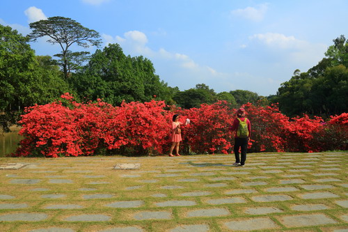 年刚过完,这杜鹃花已经耐不住性子迫不及待地开花了。是啊,一夜之间,羊城已进入夏天,如果再不开花就要错过春天了。如今,一入华南植物园正门,就能看到一大片火红的杜鹃花开得格外灿烂,艳丽的颜色,在满园绿色的衬托下,显得格外鲜艳夺目,过往的游客无不驻足观赏,拍照留影。