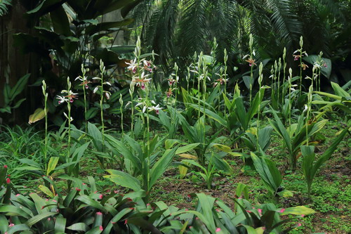 鹤顶兰属(Phaius Lour.)于1790年创立,其拉丁名Phaius的意思是深颜色的花朵,但其实鹤顶兰属的花朵也不乏鲜艳的颜色。鹤顶兰属约有50种,我国有8种,全部可供观赏。鹤顶兰的栽培历史已有200多年,1778年欧洲人从中国引入第一株鹤顶兰后,在西方就开始了对鹤顶兰连续不断地研究和培育。目前市场上的鹤顶兰栽培品种已经十分丰富,加上它花期长,有香气,早已成为人们喜爱的盆栽花卉。除鹤顶兰外,我园还栽培有黄花鹤顶兰(Phaius flavus),叶具黄色斑点,花淡黄色,不完全开放,唇瓣具3-4条褐色条纹)、仙笔鹤顶兰、紫花鹤顶兰等。