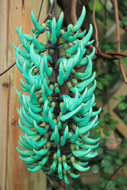 翡翠葛(Strongylodon macrobotrys A. Gray)又名碧玉藤,豆科碧玉藤属木质藤本,来自菲律宾。其花朵沿着花梗呈平展状生长,每一串花有数十朵,每一朵盛开的花像是一只翡翠雕琢而成的小鸟。花碧玉色透蓝色光泽,在阳光的照耀下,如翡翠般晶莹剔透,含苞的酷似翡翠象牙,盛开的如同翡翠雕琢而成的金刚鹦鹉的喙,弯弯上翘的龙骨瓣甚为张扬。