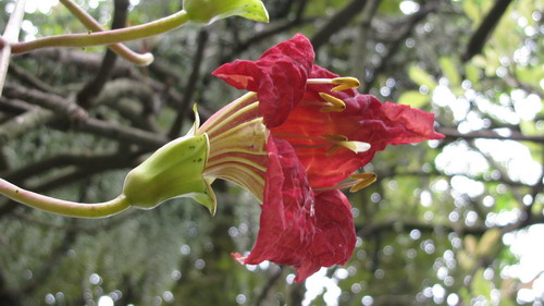 4月中旬的一天午后时分,微雨中信步来到华南植物园中心大草坪,在办公楼和贵宾手植树区交界处,满地硕大深红花朵,抬头发现是枝叶匝密的吊瓜树。在别处见过挂果的吊瓜树,但花却是第一次见到。眼睛有福了,草地上、树周边,美且硕大的红花目不暇接,那天顾着观赏、拾捡,忘了给树为花拍一张照片。