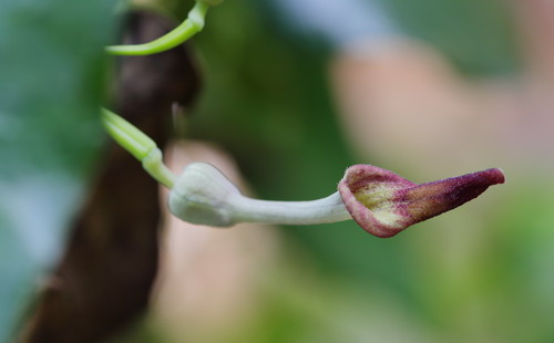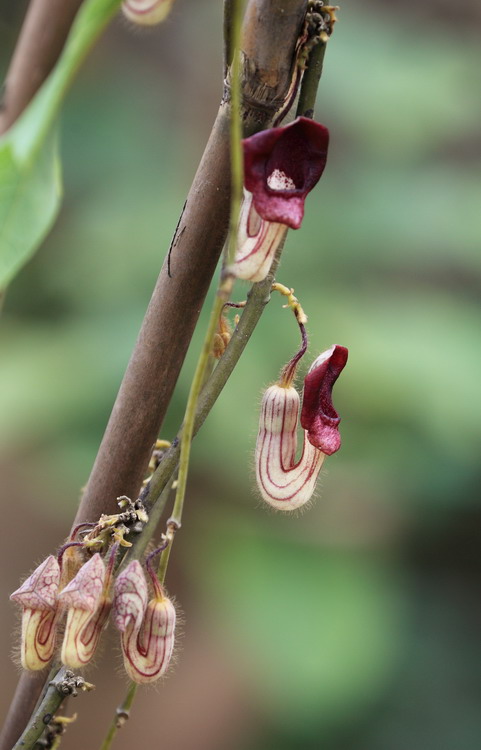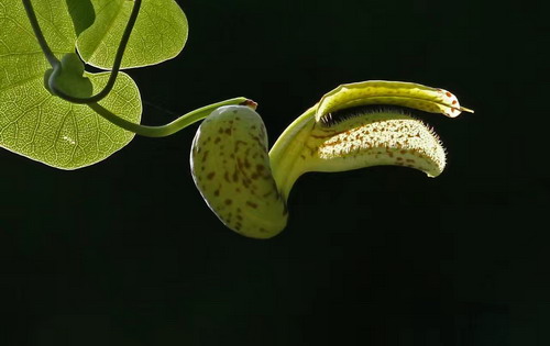 马兜铃科植物大多是藤本,花朵有的在藤的末端,随风飘动,暴露易见;有些则长在靠近藤的根部,被叶子遮挡,需要一双猎人般的眼睛才能看到,如广西马兜铃(Aristolochia kwangsiensis),它也是马兜铃家族中颜色较为艳丽的一种。
