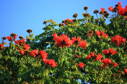 火焰木(Spathodea campanulata)又称火焰树,和前段时间介绍的吊瓜树、蓝花楹一样,同属于紫葳科,属名Spathodea 来自于希腊文spathe(意为佛焰苞的),形容它的花萼如佛焰苞状,种加词campanulata(意为钟状的),描述它的花为钟形。紫葳科主要分布在热带美洲,然而火焰木所在的火焰木属却是非洲特有属,且是单种属,所谓单种属就是属下面仅有一个种。