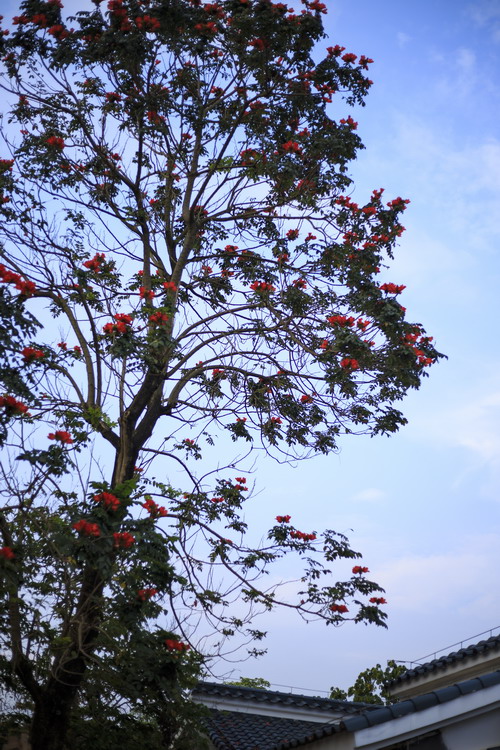 近日雨季开始来袭,夏天也在悄悄的逼近。此时火焰木已进入盛花期,一个个花序簇立在枝顶,犹如火焰燃烧在绿叶中,好不形象。