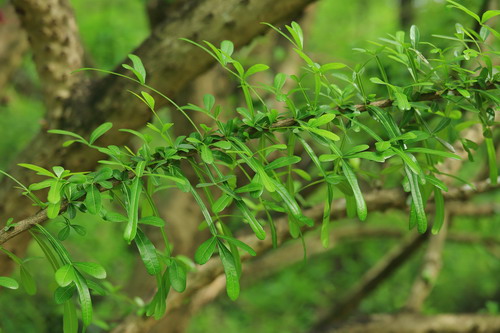 叉叶木(Crescentia alata Kunth)是紫葳科葫芦树属常绿小乔木,株高3-6m,叶簇生于小枝上,小叶3枚,十字形,长倒披针形或倒匙形,近无柄,侧生小叶2枚,花1-2朵生于小枝或老茎上,雄蕊4枚,花冠佛焰苞状,具紫褐色斑纹。花期5-6月和10-12月,炎夏花正鲜,叉叶木树身开花,远远望去,如成群紫色小高脚杯附着其间,温润敦厚,洗练的美。