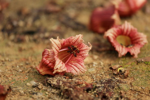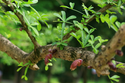“人世间有百媚千红,唯独你是我情之所钟”,叉叶木的花没有艳冠群芳,但无数人偏偏不爱红妆爱素颜珍视它,就像某些东西需经过时光的发酵,你才会发觉它的弥足珍贵一样,经过岁月雕琢的叉叶木自有奇妙之处,形美志更坚。叉叶木属于外来种,树形不整齐,原产南美热带地区,有着浓郁的异域风情,为热带雨林里中下层树种,和紫葳科的火烧花、铁西瓜等都具有典型 “老茎生花结果” 特征。植物一般在一、二年生的枝上开花结果,但在热带雨林中植被丰富,遮天蔽日,生存竞争异常激烈,花朵为便于植物“红娘”更好为其传粉,也为了躲过狂风暴雨,此外其粗壮的树干也能承受果实和大量种子的重压,有利生存繁衍,于是经过漫长岁月进化出了老茎甚至老干上开花结果的本领。叉叶木的生存智慧着实让人大开眼界。人类生存需要智慧,植物亦然。