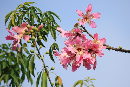 美丽异木棉(Ceiba speciosa (A.St.–Hil.) Ravenna),木棉科落叶大乔木。树干下部膨大,密生圆锥状皮刺。掌状复叶有小叶5—9片。花冠淡紫红色,中心白色;也有花冠白色,中心黄色。花瓣5枚,卵形,略反卷;花丝合生成雄蕊管。花期8—10月。